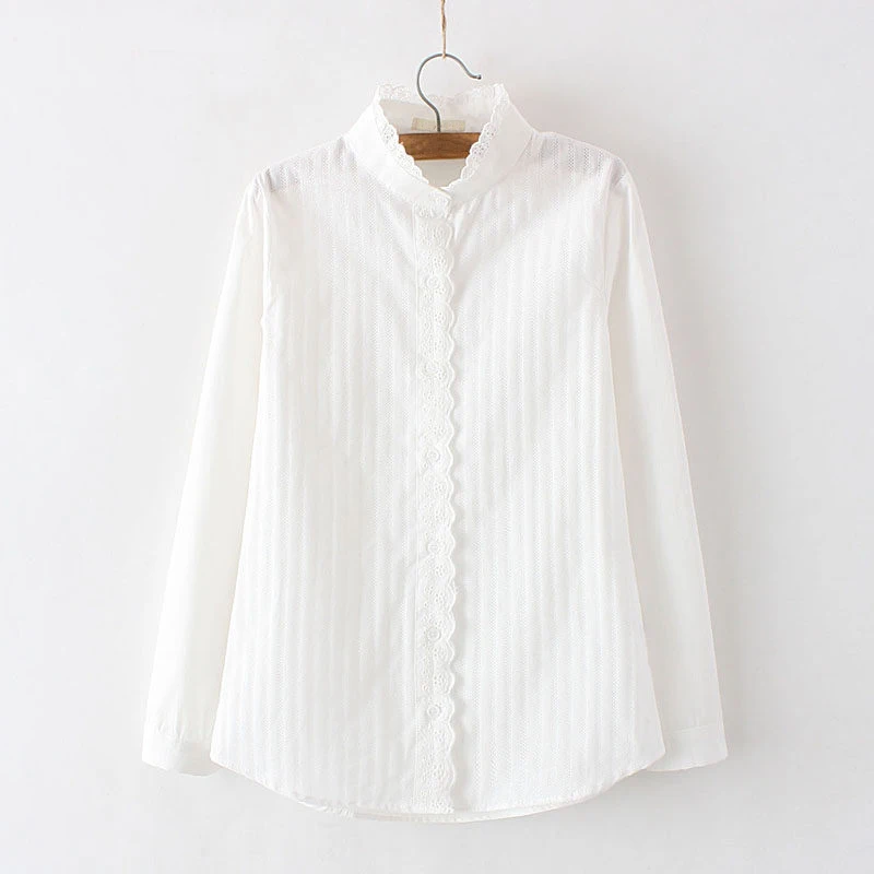 discount Women Lace White Shirts Summer Spring Long-sleeve Ruffled 100% Cotton Slim Soft Blouse Tops 0.15 Kg